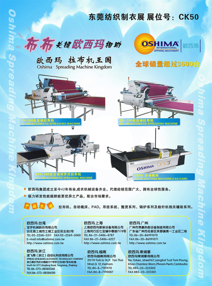 展出機(jī)型:拉布機(jī) 自動(dòng)裁床 粘合機(jī) 檢針機(jī) 鍋爐